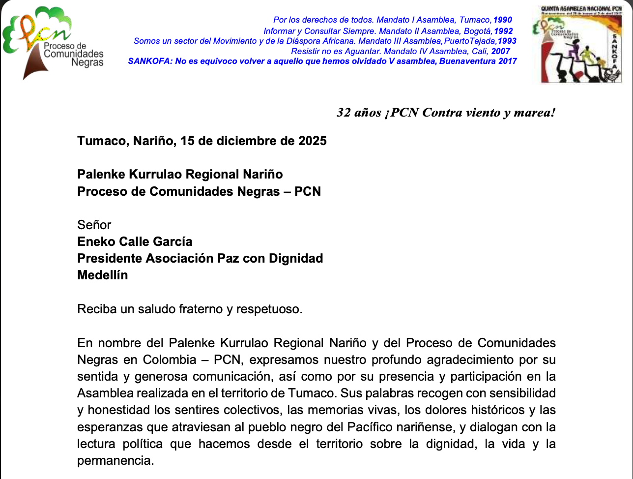 Asimismo, extendemos esta invitación para que dicho acompañamiento se proyecte en las demás acciones humanitarias, políticas y de incidencia que el Proceso de Comunidades Negras en Colombia – PCN adelanta a nivel nacional, en coherencia con la defensa de los derechos de los pueblos negros, afrocolombianos, raizales y palenqueros, y con la construcción de una paz con justicia racial, social y territorial, entendida no como concesión, sino como conquista colectiva.