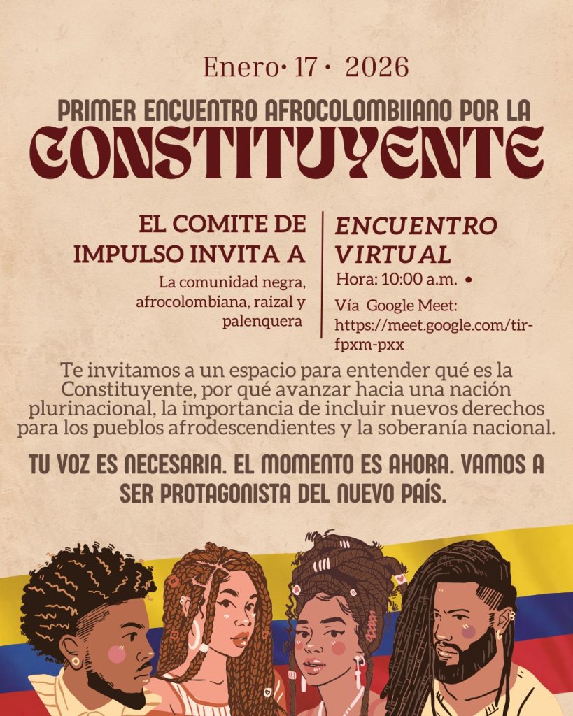 Invitamos a la comunidad negra, afrocolombiana, raizal y palenquera a participar en el Primer Encuentro Afro por la Constituyente, un espacio de diálogo y construcción colectiva donde hablaremos sobre qué es el proceso constituyente, el nuevo paradigma de una Constitución construida desde los pueblos, la importancia de una nación plurinacional, la soberana nacional y la necesidad de incorporar nuevos derechos para los pueblos afrodescendientes, en respuesta a nuestras luchas históricas.