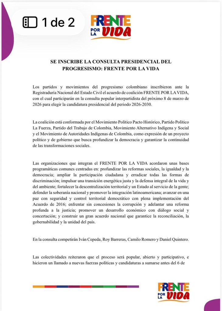 Este 8 de marzo de 2026 el progresismo se medirá en una consulta abierta y participativa dentro de la coalición Frente por la Vida. La carta que acompaña esta inscripción reafirma un propósito claro: profundizar las reformas sociales, ampliar la participación ciudadana, defender la vida y el ambiente, combatir la corrupción y avanzar hacia un país con justicia, paz y unidad. Si compartes ese horizonte, apoya a Iván Cepeda y suma tu voz en esta decisión colectiva.