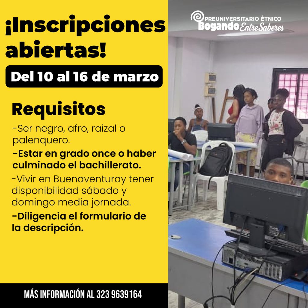 Se abre la convocatoria para participar en el Preuniversitario Étnico Bogando entre Saberes, Preparación para el Acceso a la Educación Superior, un espacio formativo dirigido a jóvenes del casco urbano de Buenaventura que desean prepararse para ingresar a la universidad.