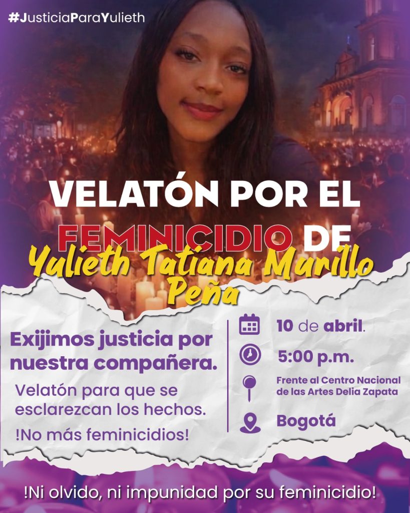 Yulieth Tatiana Murillo Peña fue asesinada el 4 de marzo del presente año en su casa. Aunque hay sospechosos e indicios no ha habido avances en la investigación. La violencia patriarcal y racista cuesta la vida de las mujeres negras e impide el acceso a la justicia quedando en la impunidad.