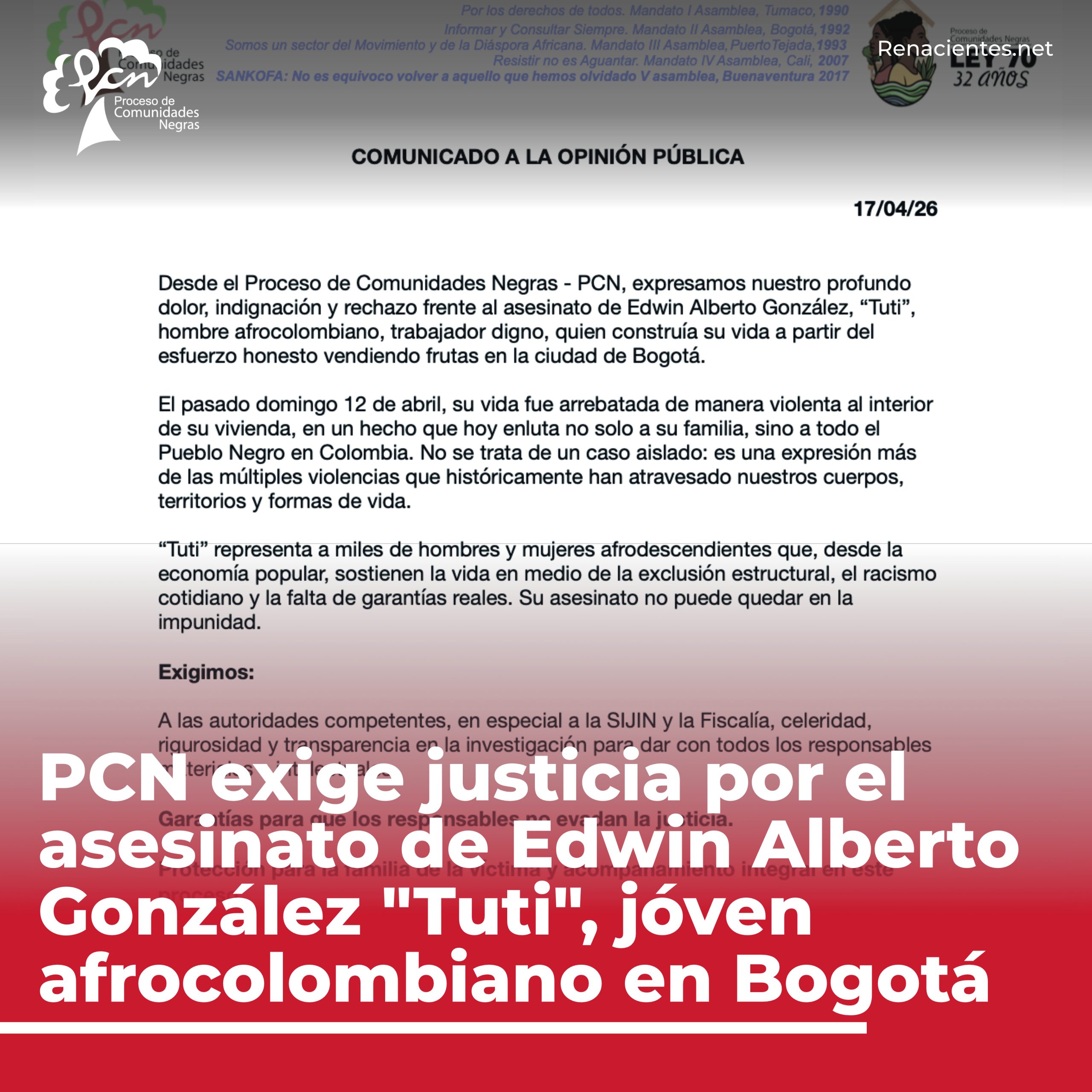 Desde el Proceso de Comunidades Negras – PCN, expresamos nuestro profundo dolor, indignación y rechazo frente al asesinato de Edwin Alberto González, “Tuti”, hombre afrocolombiano, trabajador digno, quien construía su vida a partir del esfuerzo honesto vendiendo frutas en la ciudad de Bogotá.