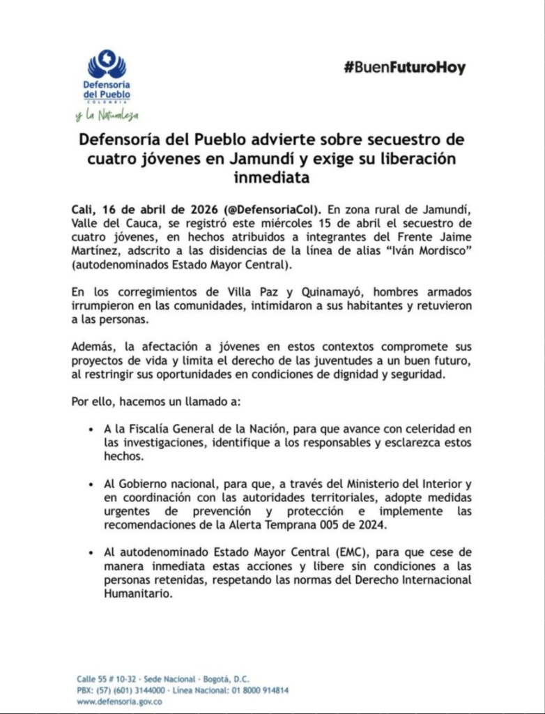 El secuestro de cuatro adolescentes en la zona rural de Jamundí Valle del Cauca constituye una grave vulneración a los derechos fundamentales y una infracción a las normas del Derecho Internacional Humanitario. De acuerdo con la información oficial entregada por la Defensoría del Pueblo las víctimas tienen entre catorce y diecisiete años de edad y fueron retenidas por sujetos armados mientras se desplazaban en un vehículo por el territorio.