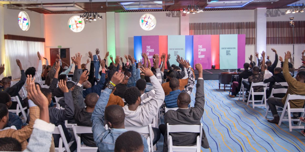 Moderadores de Contenidos ubicados en Kenia votando a favor de establecer su propio sindicato en una reunión en el Hotel Mövenpick en Nairobi, mayo 1 de 2023.